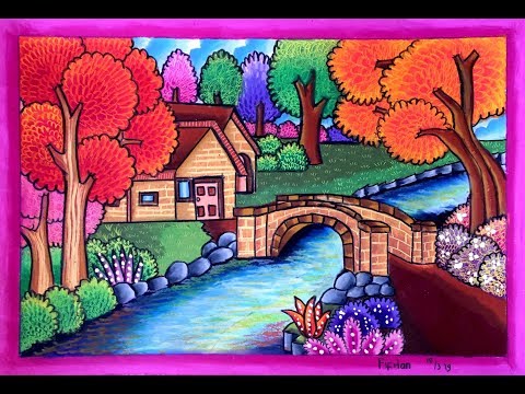 Cara Menggambar Dan Mewarnai Pemandangan Alam Rumah Dan Sungai