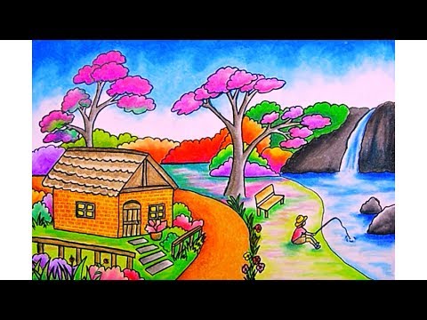 Cara Menggambar Dan Mewarnai Pemandangan Air Terjun Dan Rumah